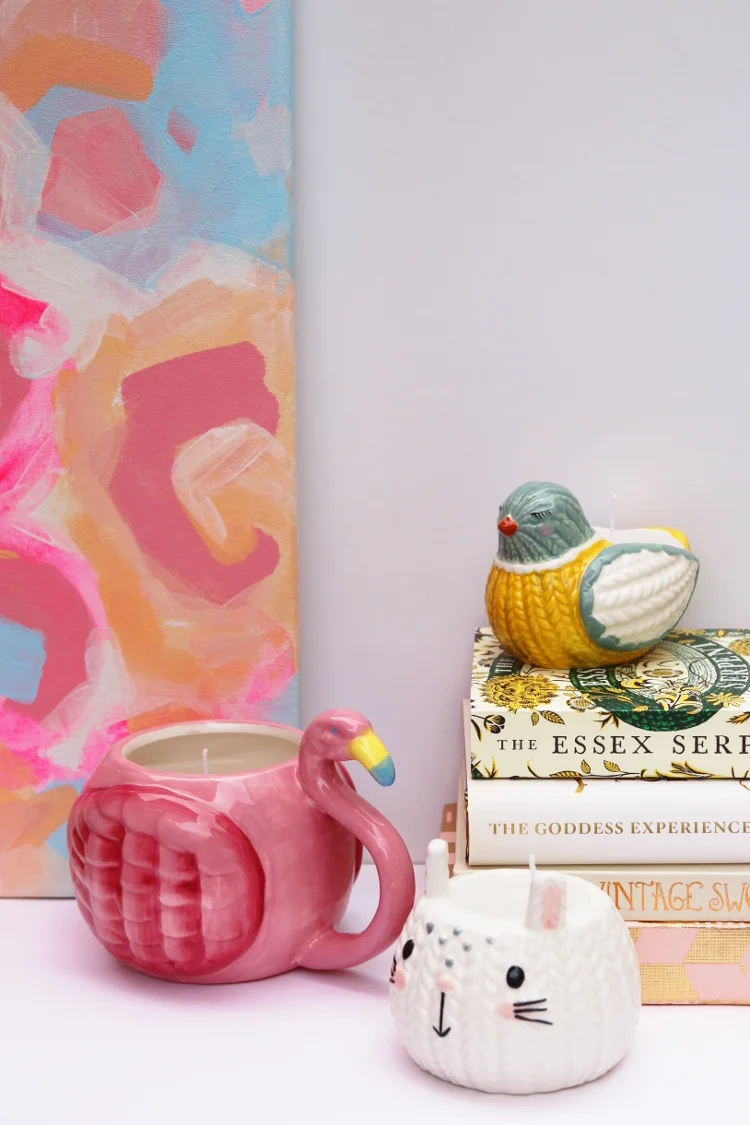 Instead of using a jar or terracotta pot I thought it would be fun to make some cute novelty candles using these adorable knitted effect rabbit and bird egg cups and this amazing giant flamingo mug I picked up from Asda last week. I mean, how cute is that bunny face? I couldn't resist.