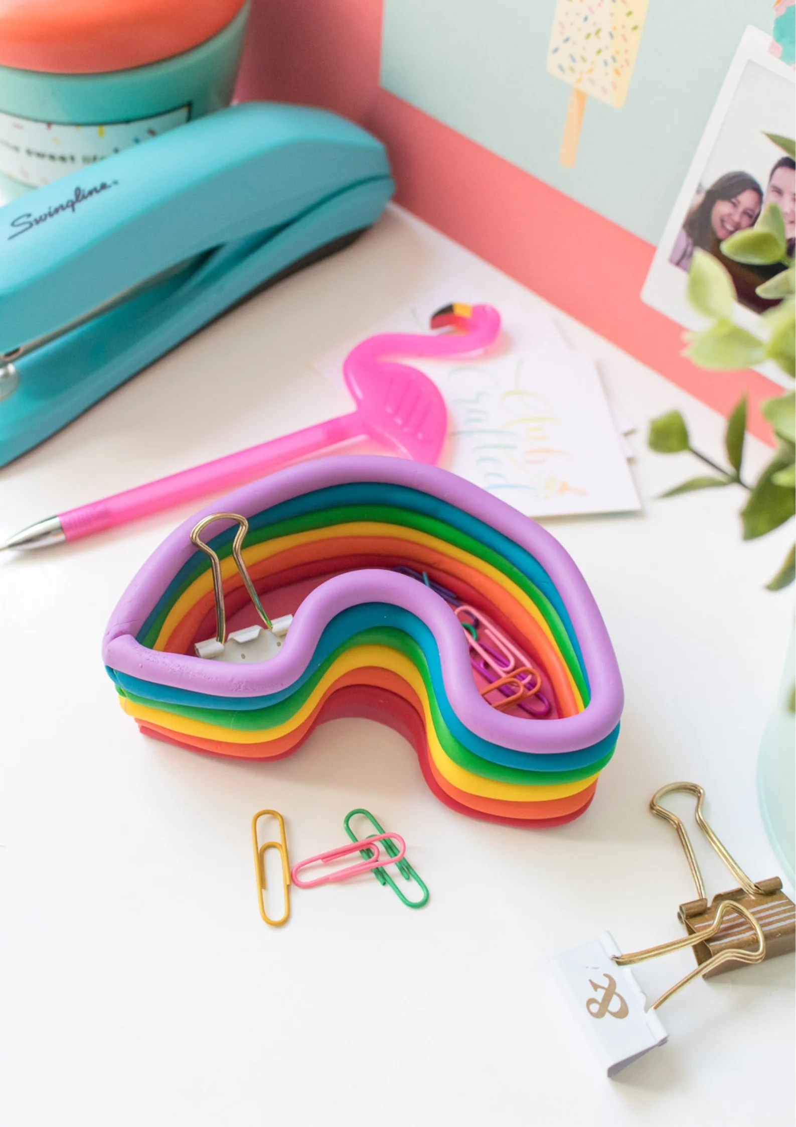 Today’s project is somewhat inspired by Rainbow Brite’s BOOTS. Yes, her boots or even her jacket. This rainbow catch-all dish with rolls of clay making a rainbow up the sides reminds me of her outfit, and it’s officially my new favorite desk accessory for catching my random paper clips and push pins.