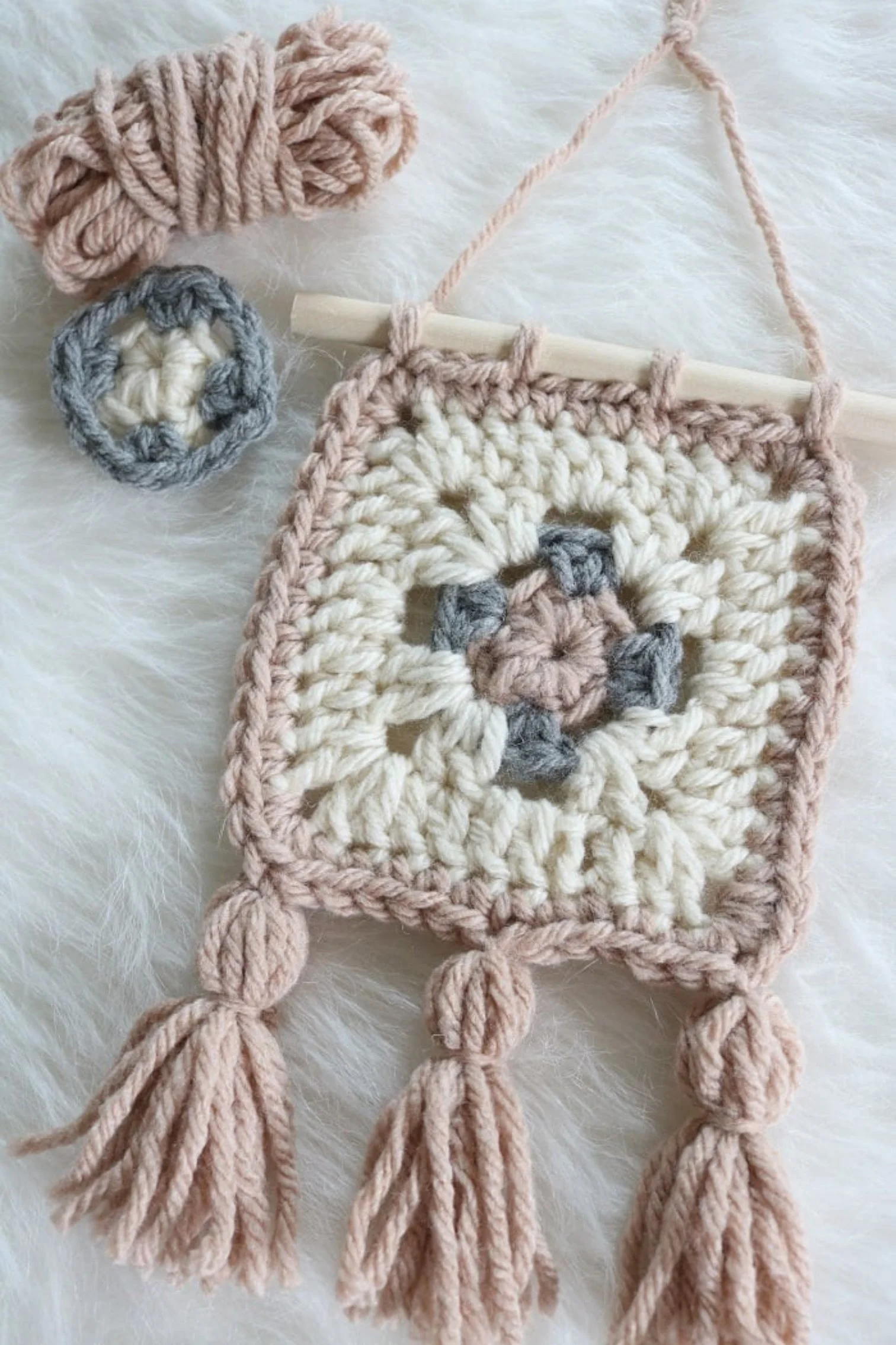 Love EASY crochet wall decor patterns to use up your yarn stash? Whether you are looking for Boho style wall hangings for your office or nursery, it’s fun to find favorite crochet wall hanging patterns. I have a simple granny square crochet wall decor pattern to share with you today!