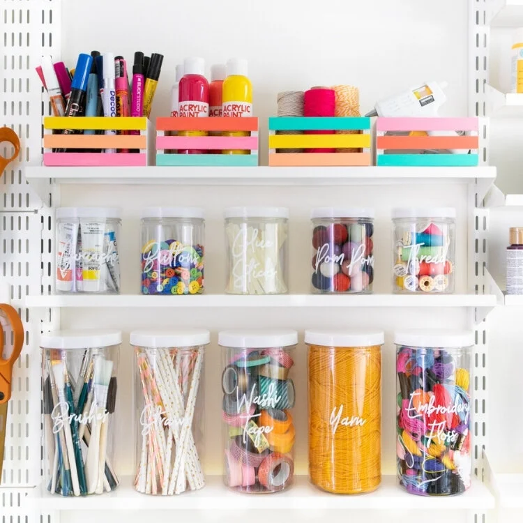 Tall clear jars look fantastic filled with your supplies complete with fun lettering. Add baskets and painted wooden paint crates to create a colourful display. The perfect craft room solution.