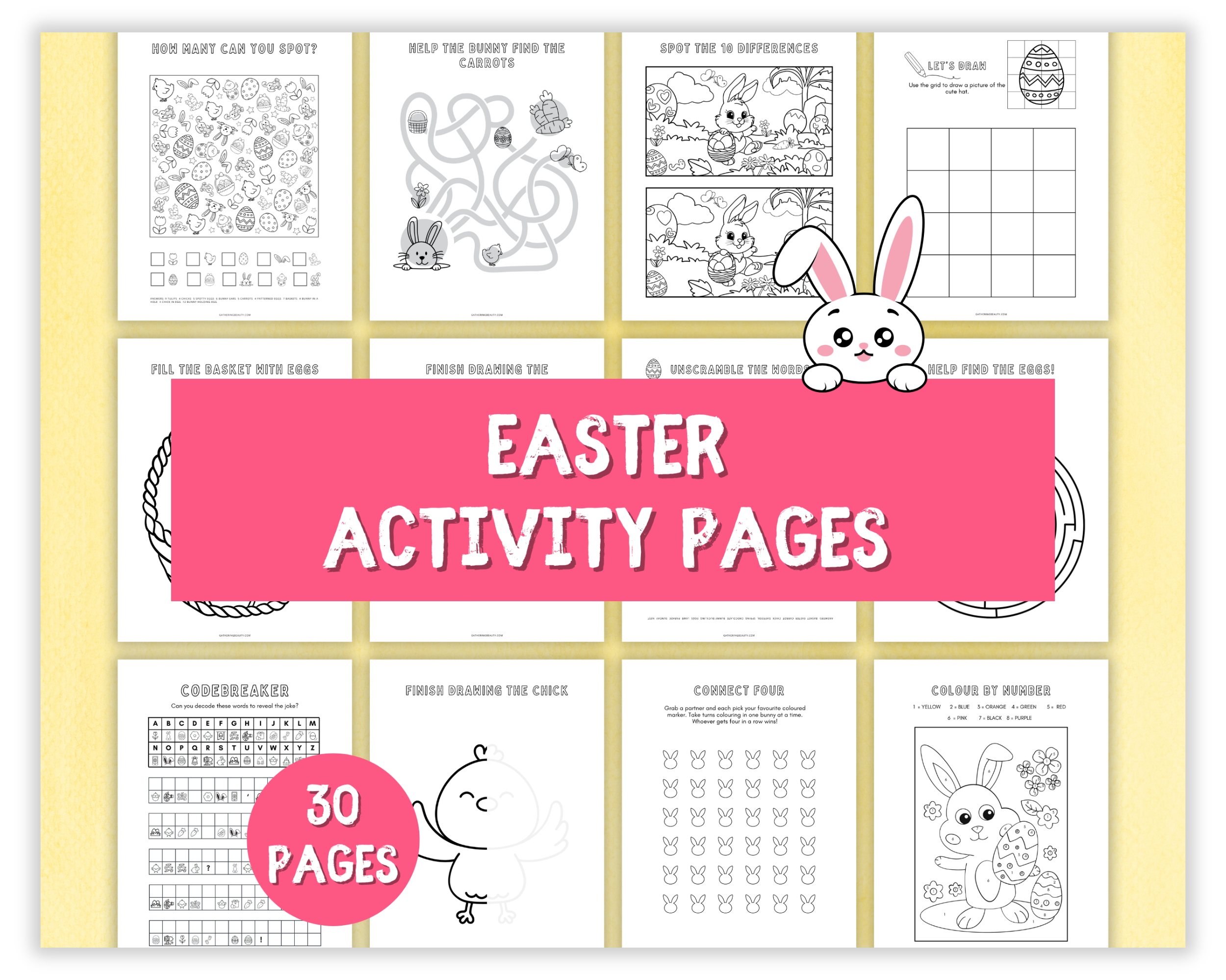 I’ve created 15 different activities to download, each one filled with lots of fun ideas for kids of all ages. You’ll find all sorts of engaging goodies like Easter word scrambles, word searches, an I-spy game, a code breaker, and a design-your-own Easter basket colouring page that’s sure to be a hit.