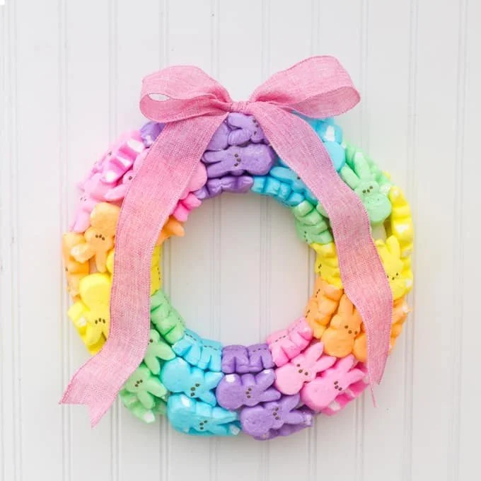 Make a super cute wreath for Easter using the classic sweet treat of bunny shaped peeps.