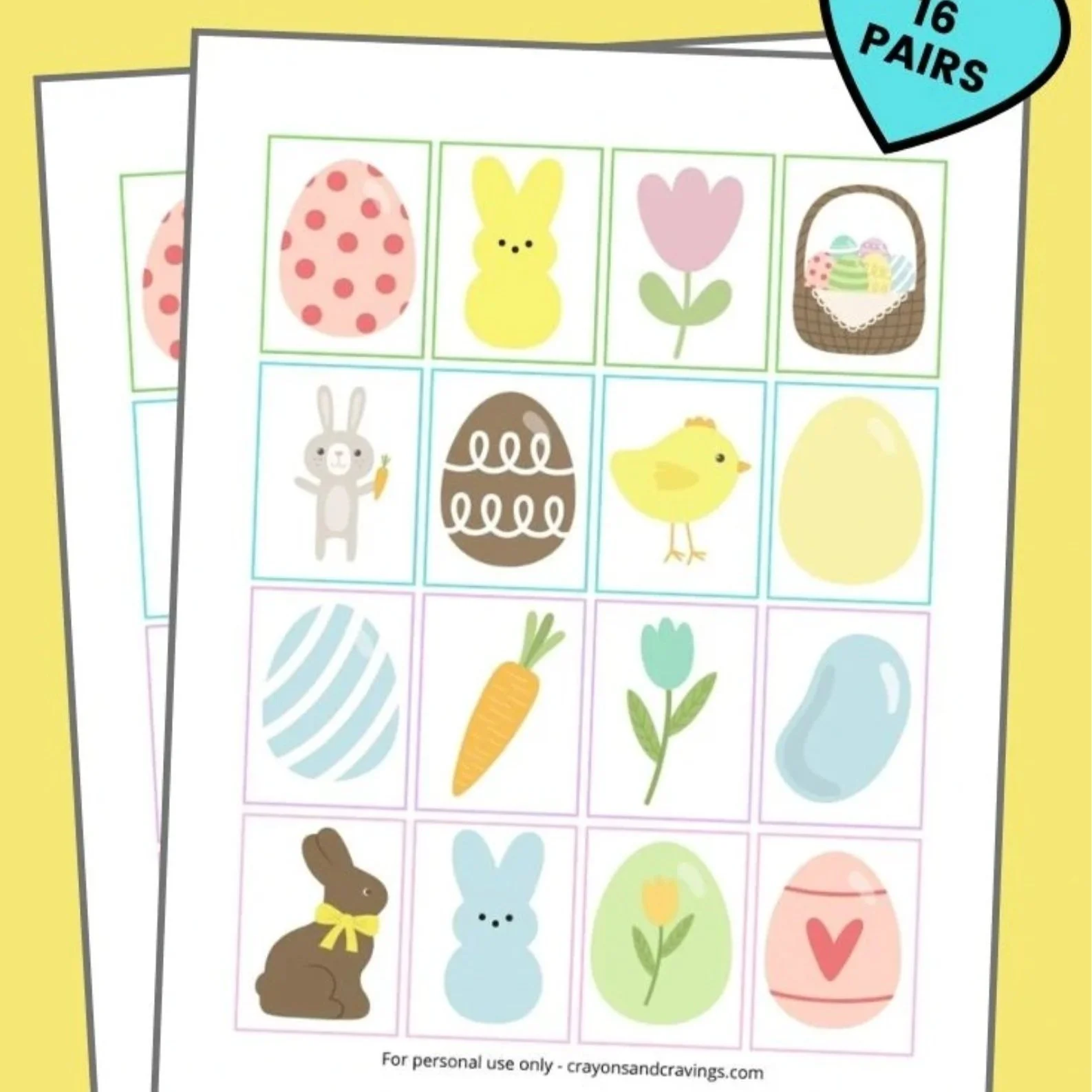 A free printable Easter memory game to play together as a family this Easter. The kids will love finding the 16 matching pairs of colourful cards!