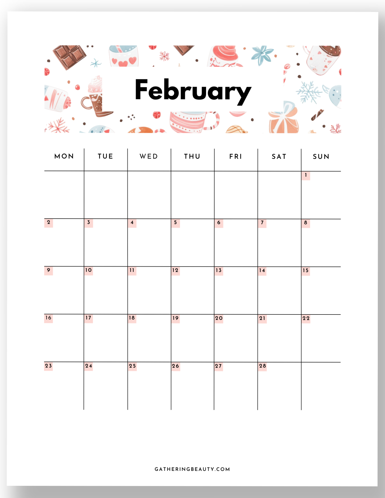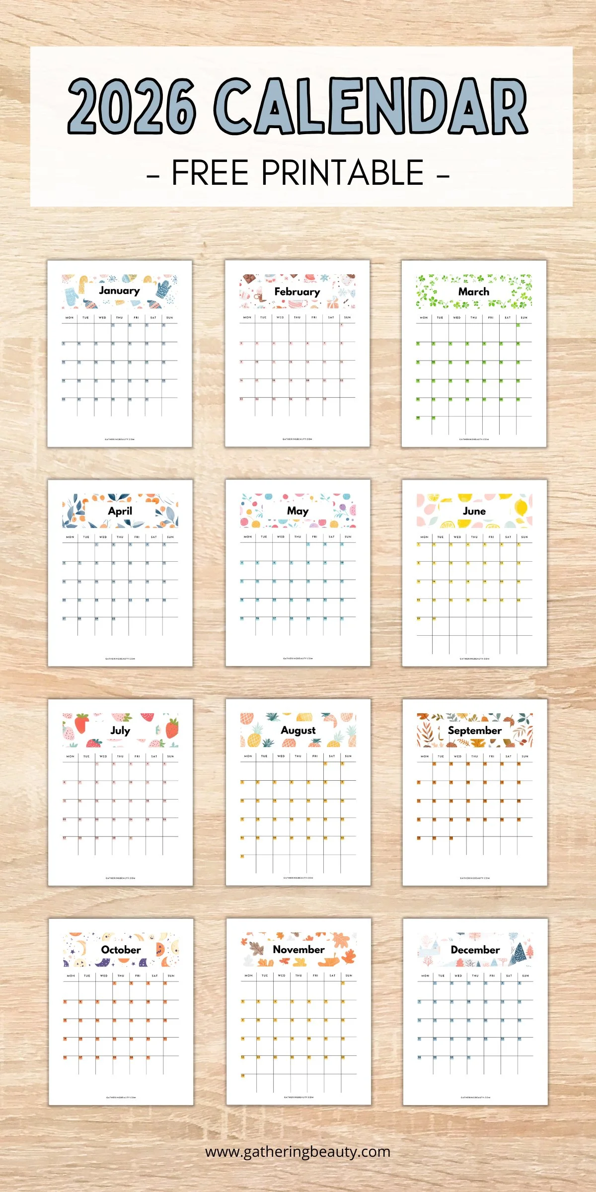 /Get organized with this Free Printable 2026 calendar! Each monthly page features a clean layout with cute seasonal designs, available in both Monday and Sunday start versions. Perfect for meal planning, budgeting, school schedules, and more.