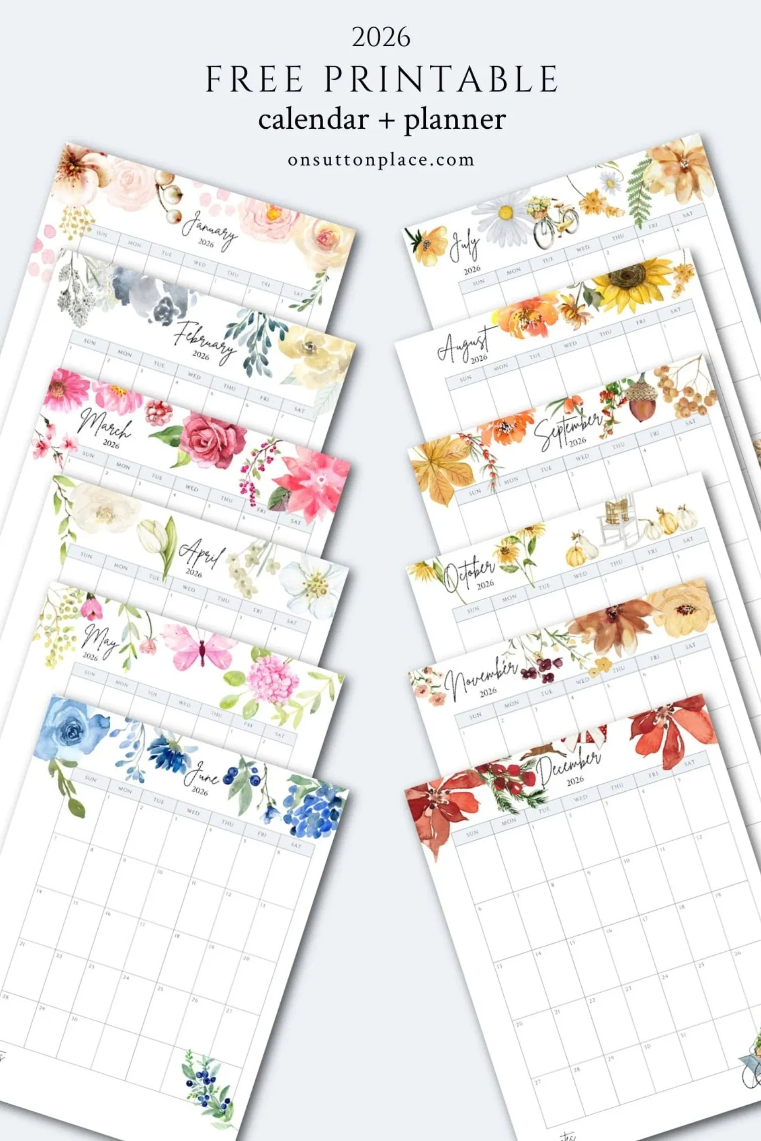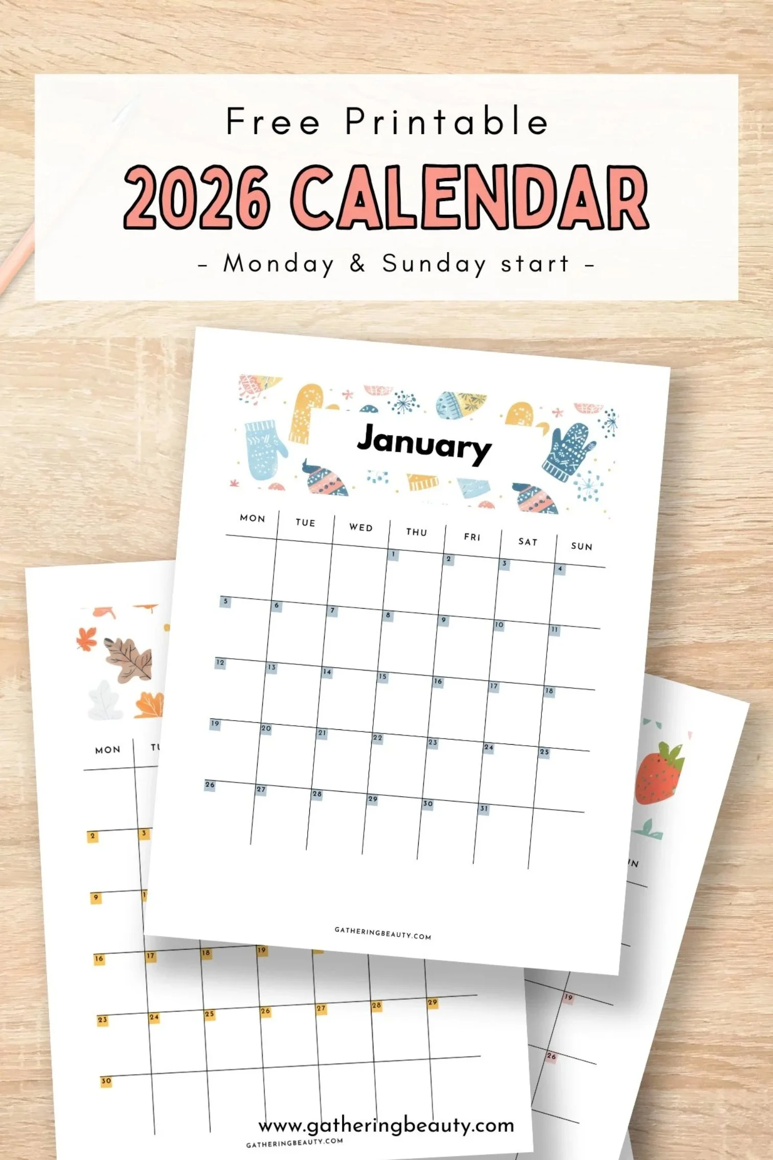 Get organized with this Free Printable 2026 calendar! Each monthly page features a clean layout with cute seasonal designs, available in both Monday and Sunday start versions. Perfect for meal planning, budgeting, school schedules, and more.