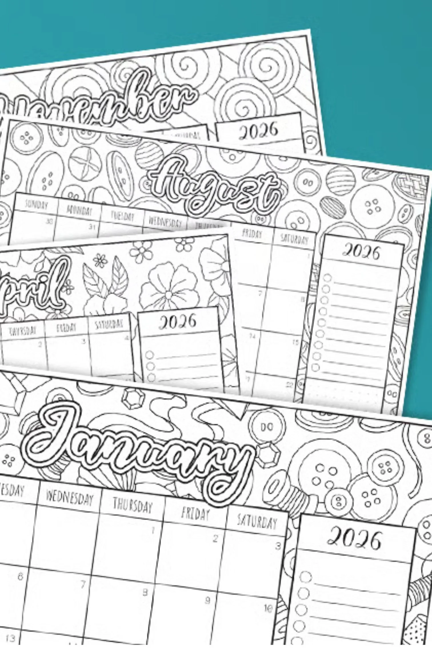 The 2026 Printable Colouring Calendar includes the full calendar year and 12 unique backgrounds ready for you to plan and colour.