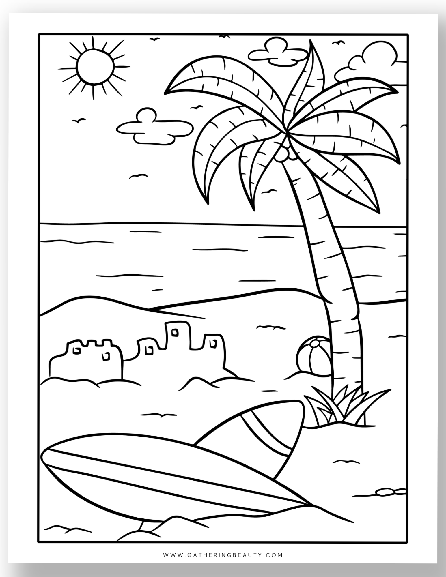 /Get ready for Summer with these Printable Beach Colouring Pages! Featuring palm trees, beautiful beach scenes and more! Perfect for kids and adults alike, these free colouring pages are a fantastic way to celebrate the sunny summer months.