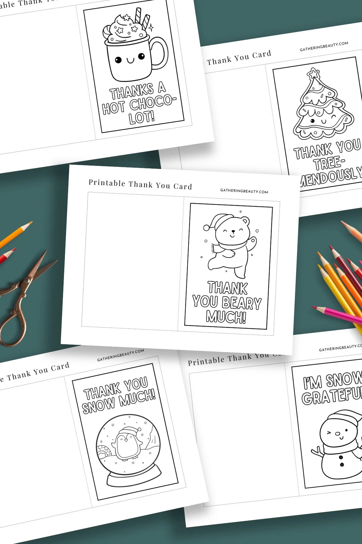 /Looking for the perfect way to say thank you after the holiday season? Download this set of Free Printable Christmas Thank You Cards with 6 different designs that you can print and colour at home, each featuring cute thank you puns that are sure to make everyone smile!