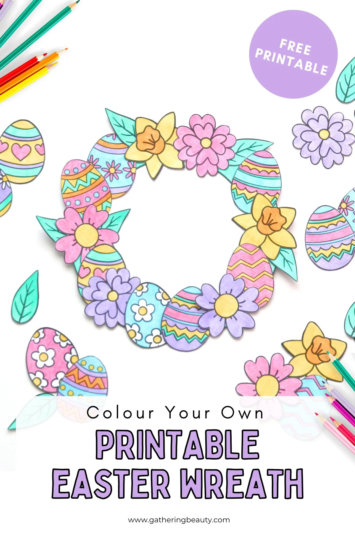 Spring is here, and what better way to celebrate than with a charming paper wreath? This printable wreath features patterned Easter eggs, spring flowers, a daffodil and pretty leaves, ready for you to colour and bring a touch of Easter magic to your home.