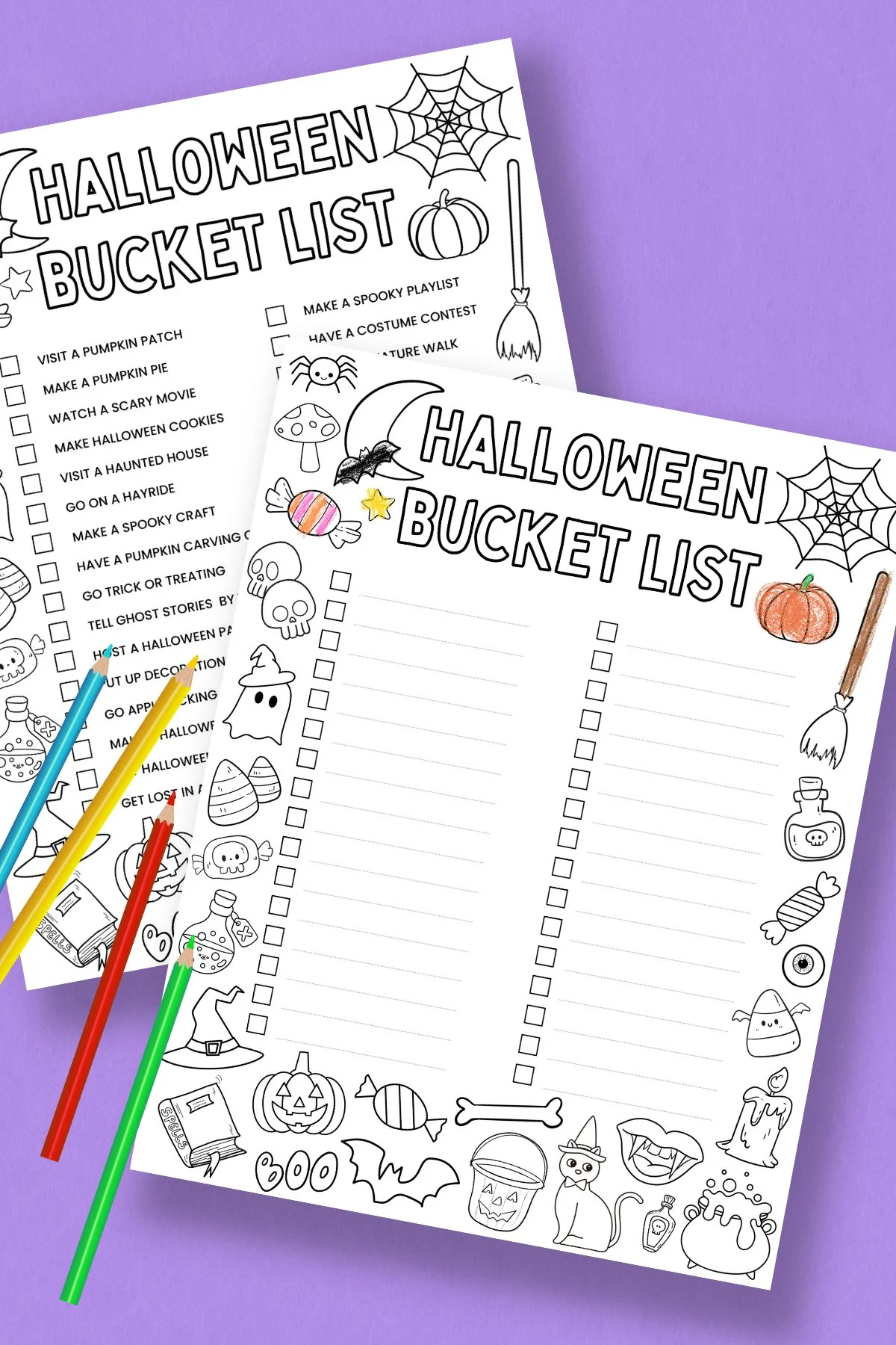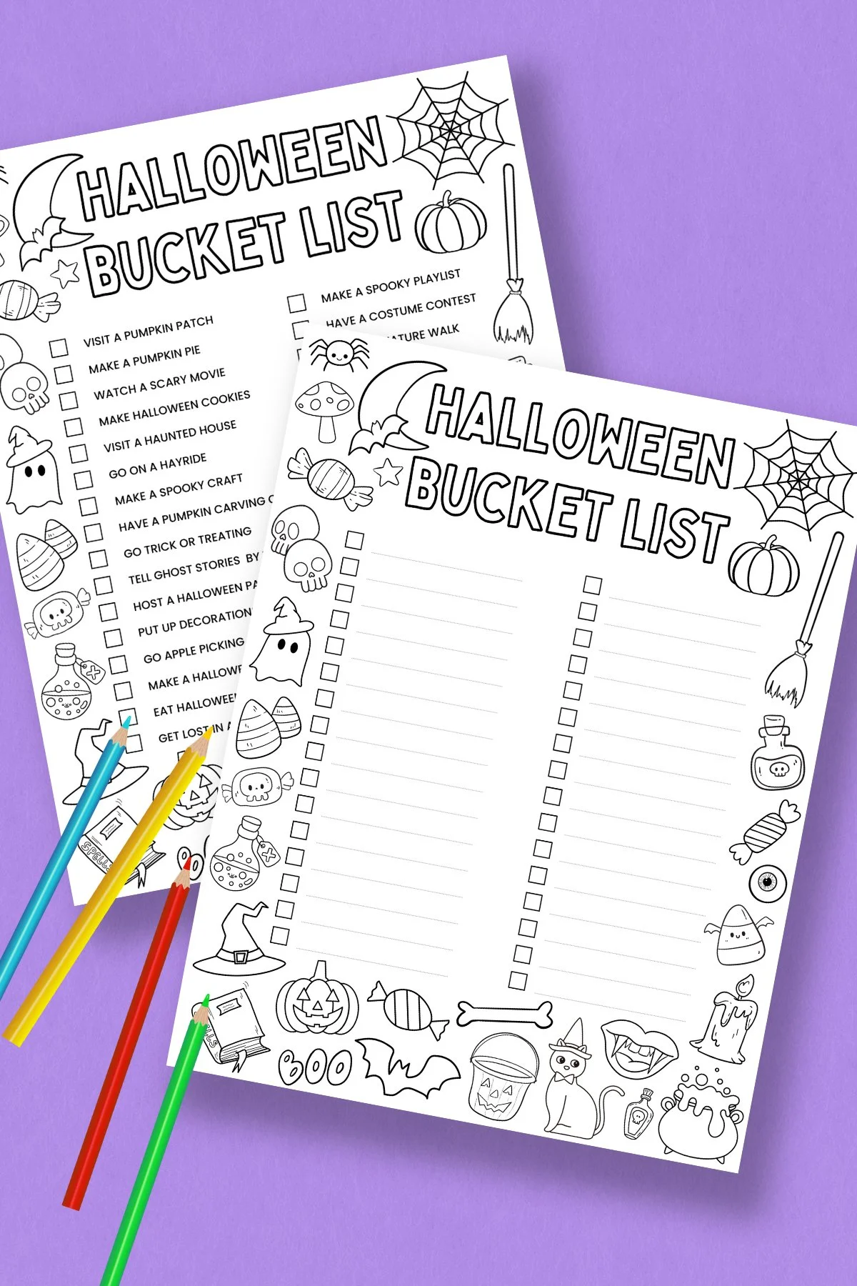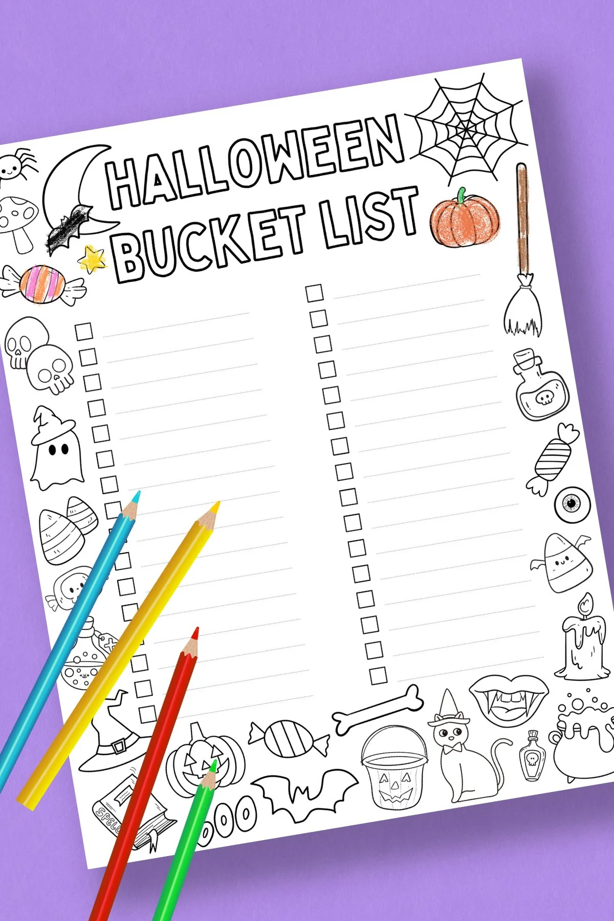 /Download this FREE Halloween Bucket List Printable that you can colour in! From pumpkin carving to hayrides, get creative while checking off your Halloween activities and adventures. Perfect for kids and families!