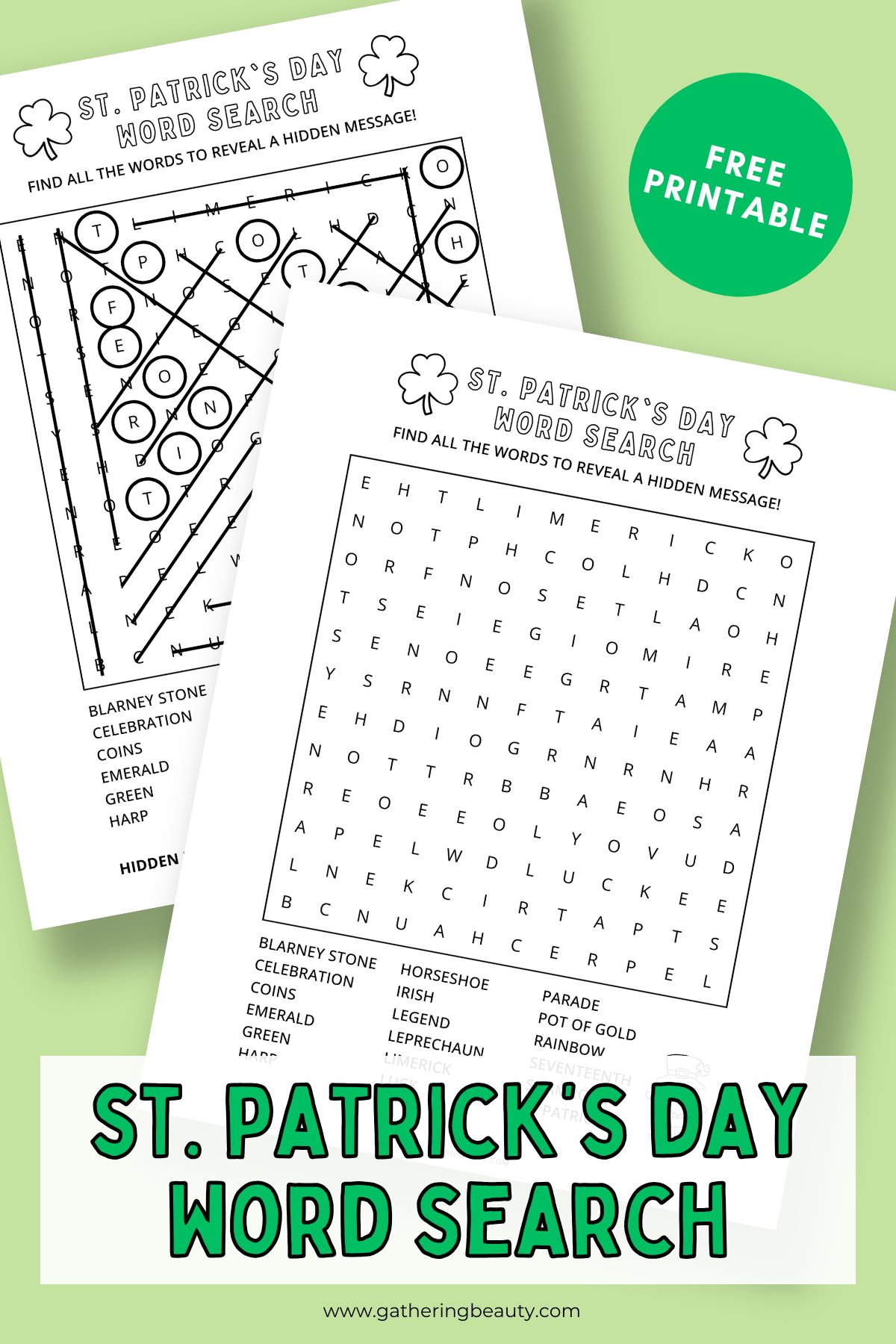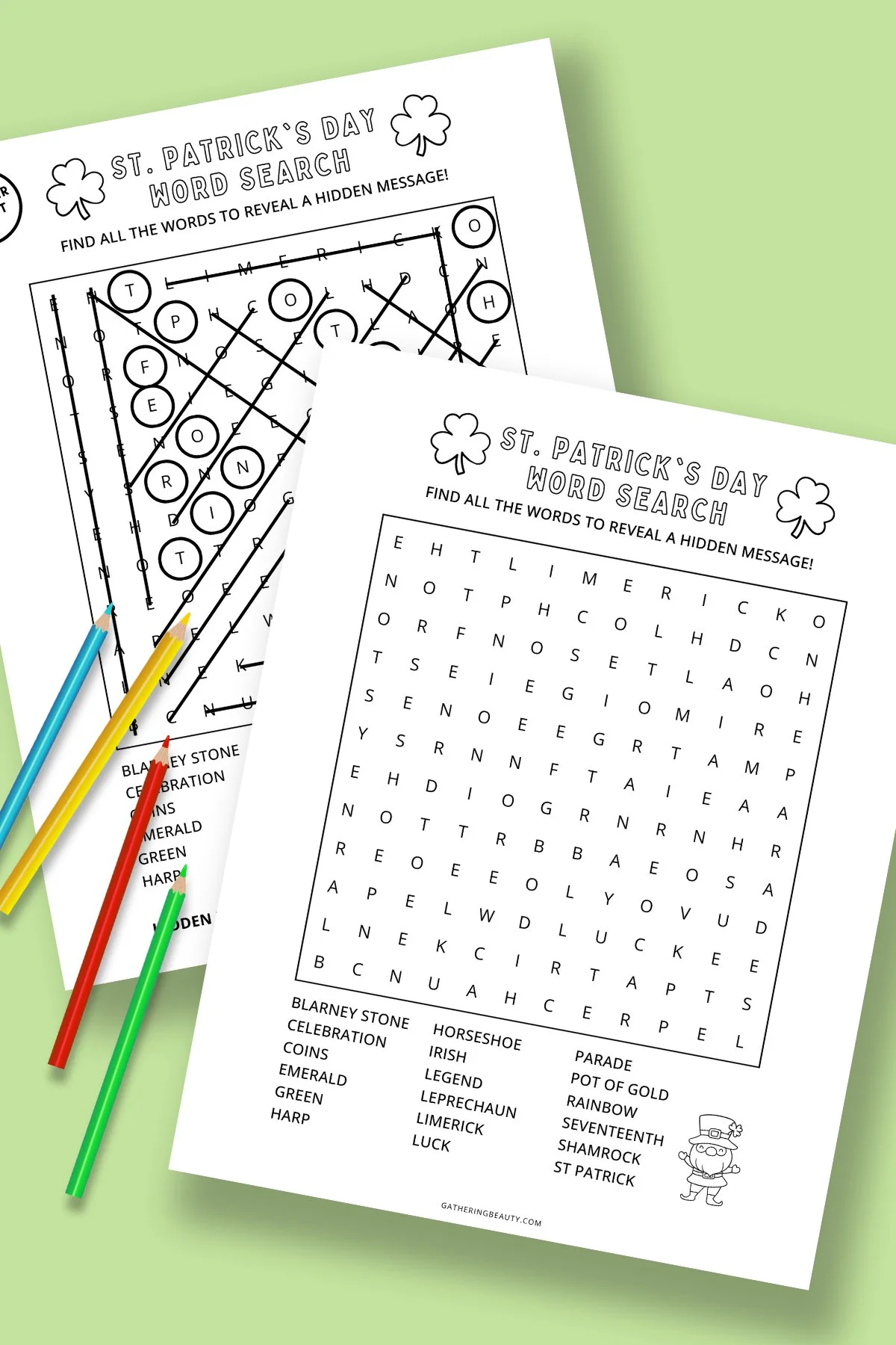 /Keep kids busy while you celebrate in green! Download these Free Printable St. Patrick’s Day Word Search Puzzles, complete with answer keys and hidden messages. A fun and festive activity for kids of all ages at your St. Patrick’s Day celebration or party!