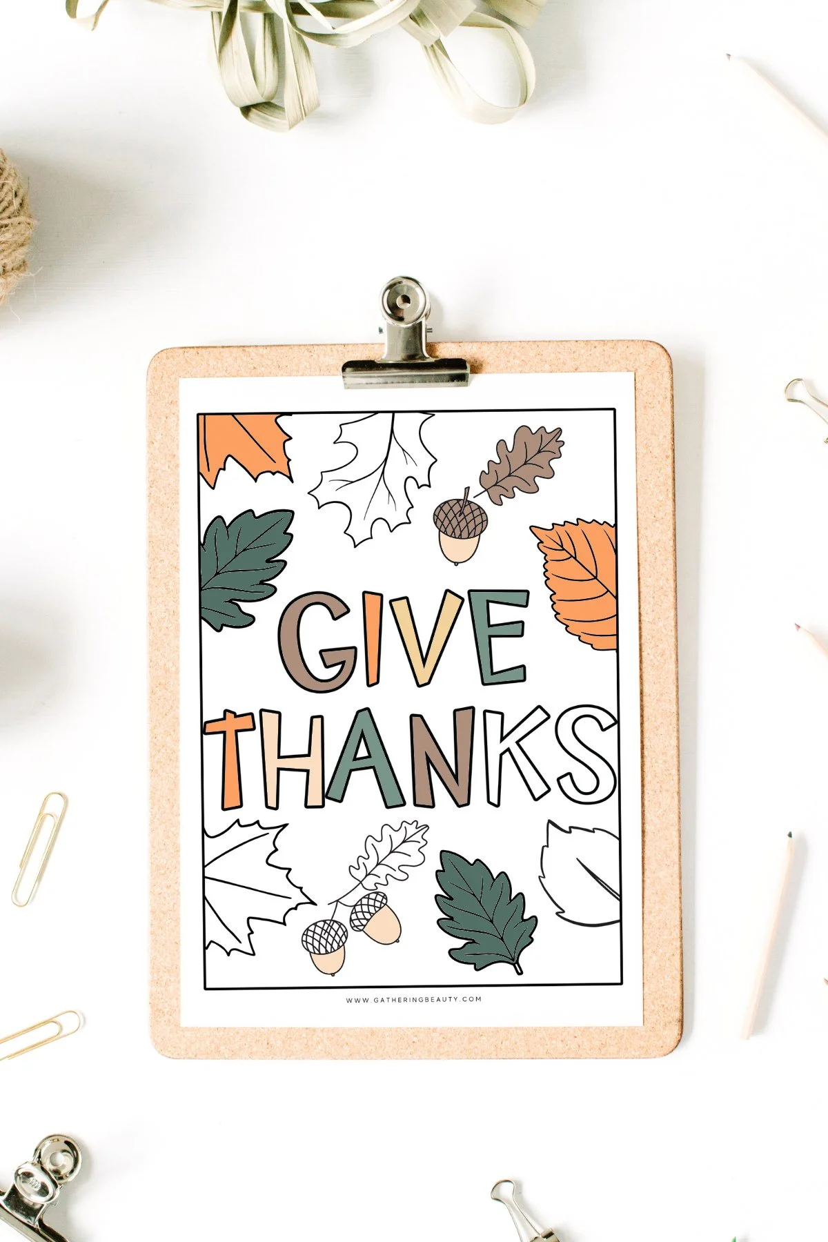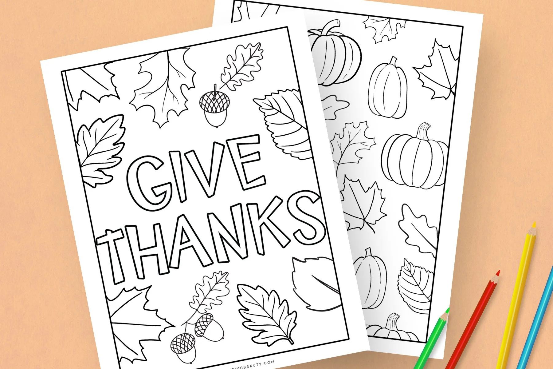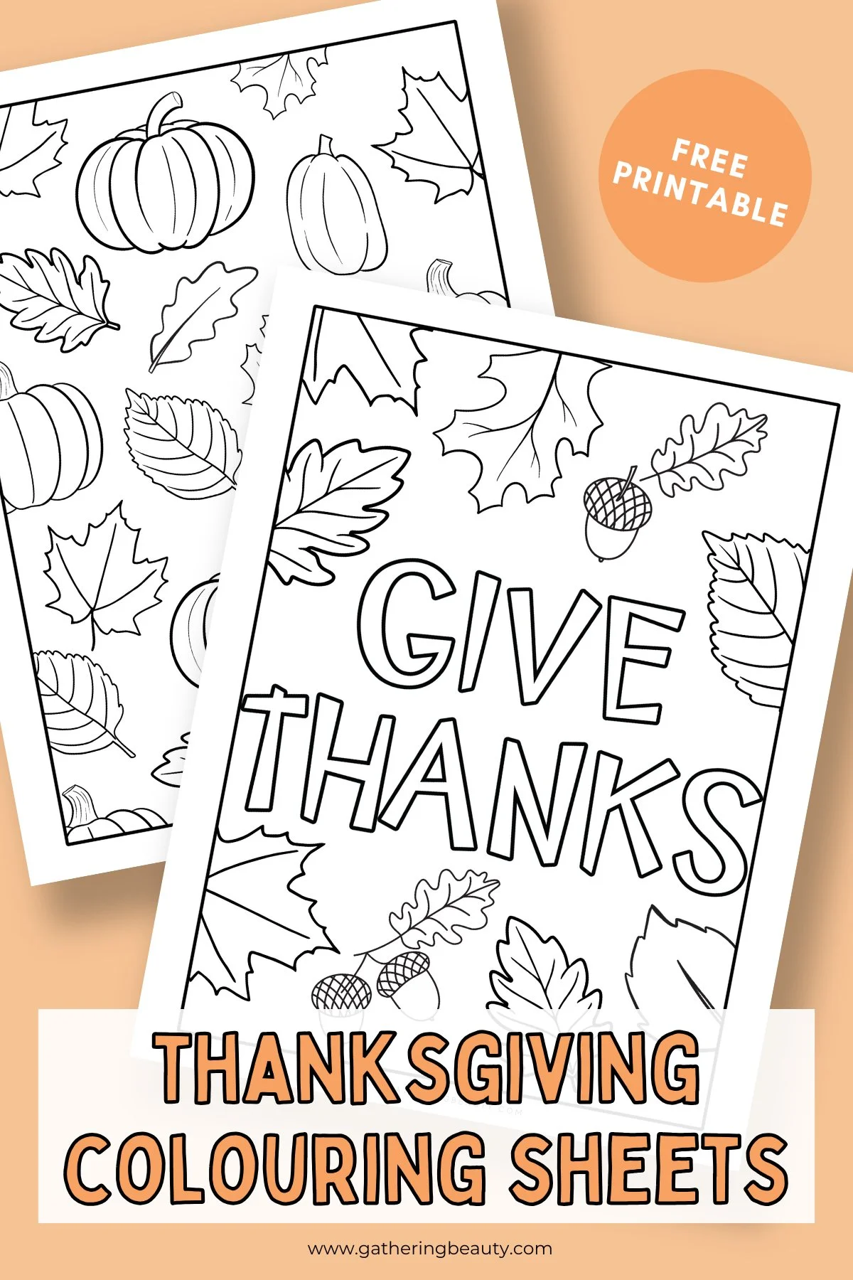 /Celebrate the fall season with these Free Printable Thanksgiving Colouring Pages! Perfect for kids, older students, and even adults, these fun colouring sheets feature pumpkins, autumn leaves, and a festive 'Give Thanks' design.