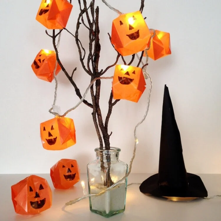 Fold a simple origami balloon, draw a scary pumpkin face on it, and voila! You have a perfectly spooky string of lights to decorate your house for Halloween.