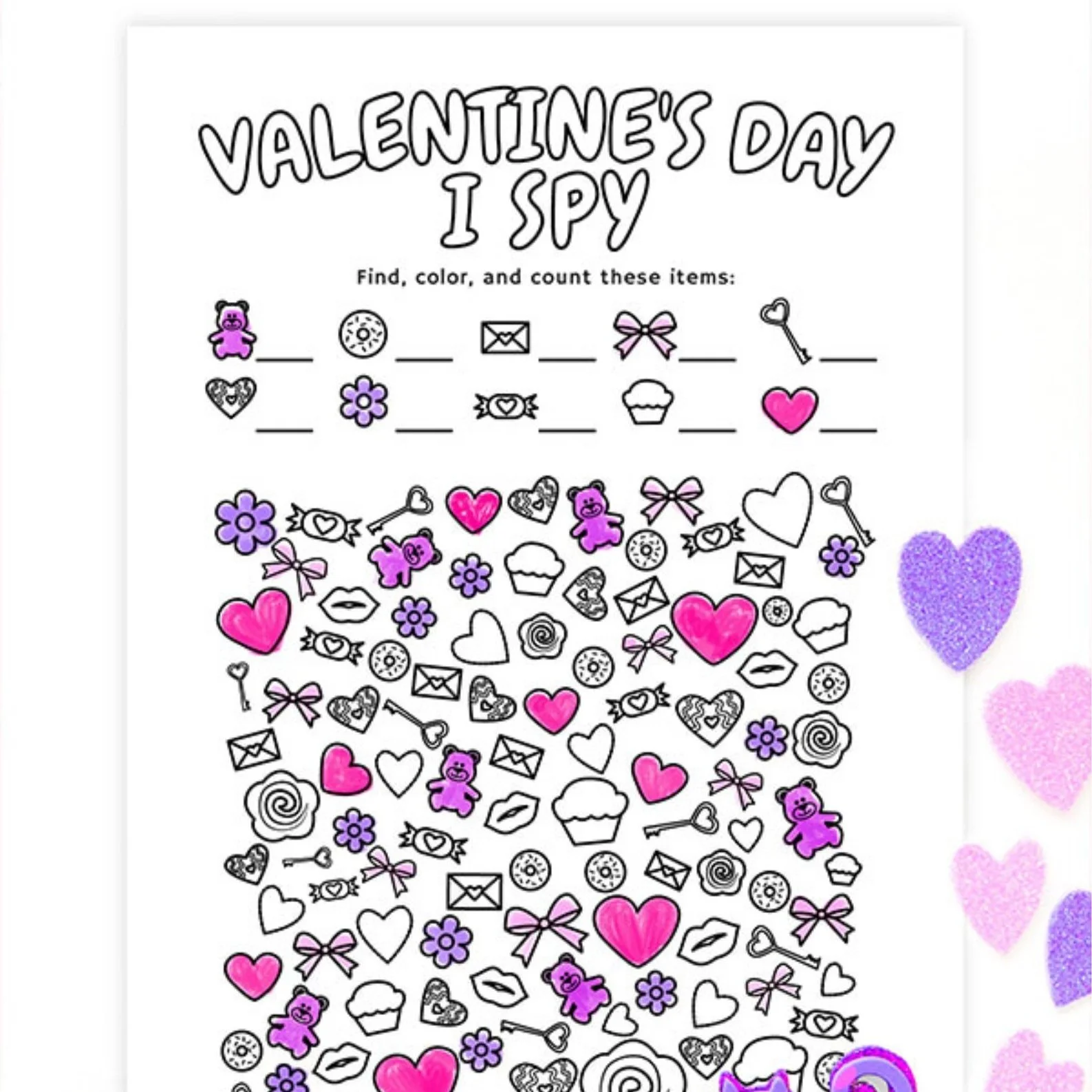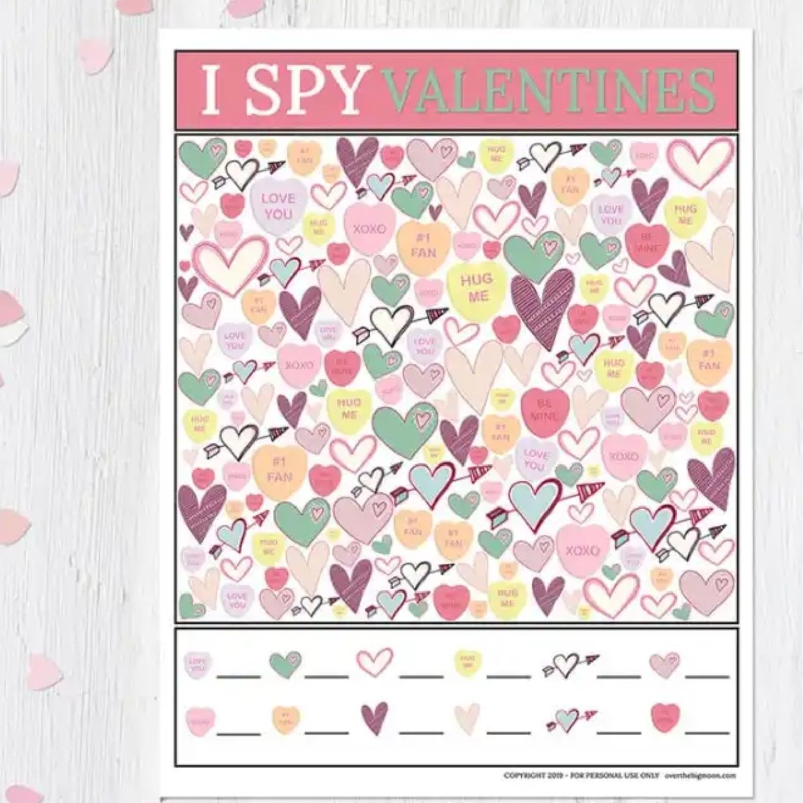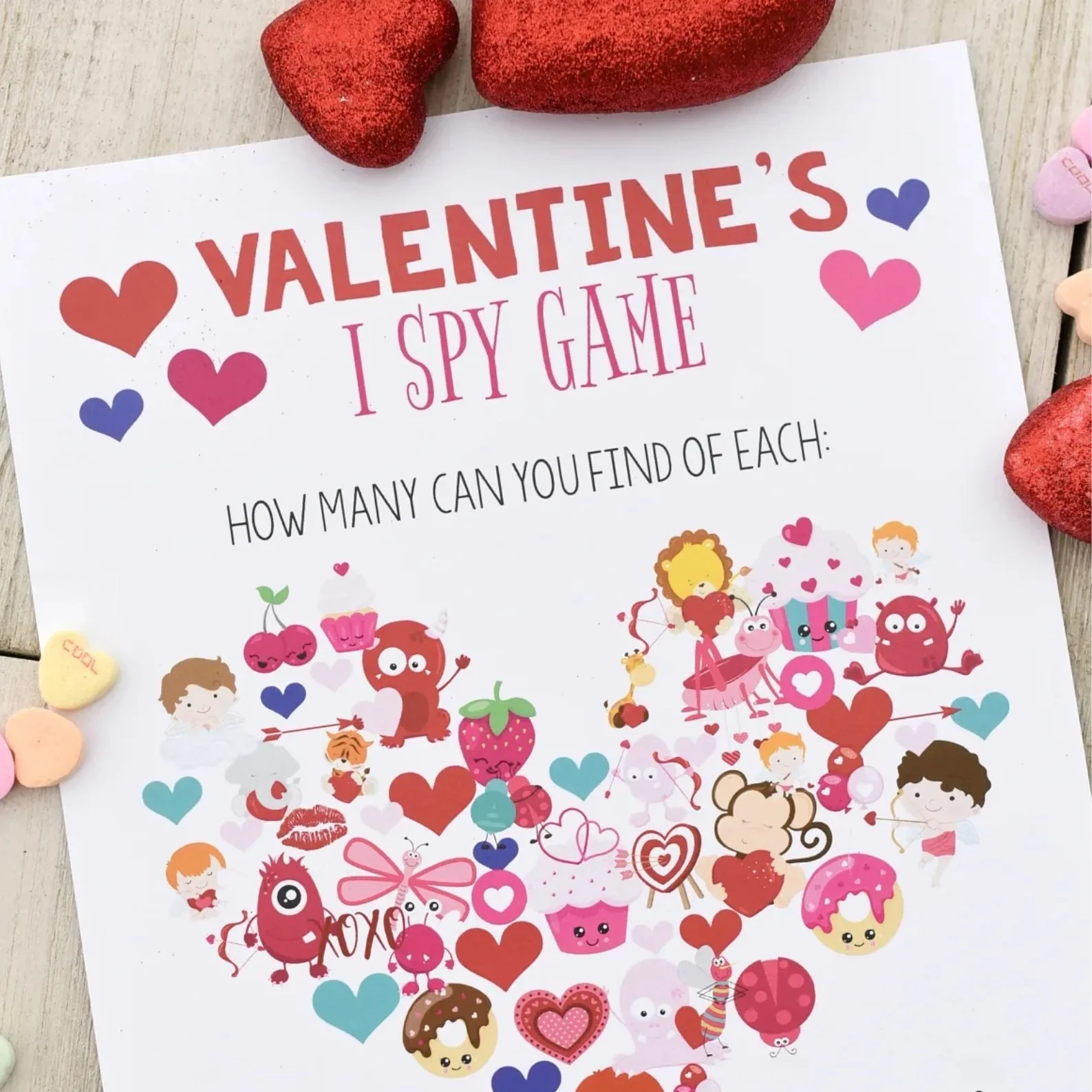 Our I Spy game is perfect for a Valentine classroom celebration activity or for a fun boredom buster for kids at home.