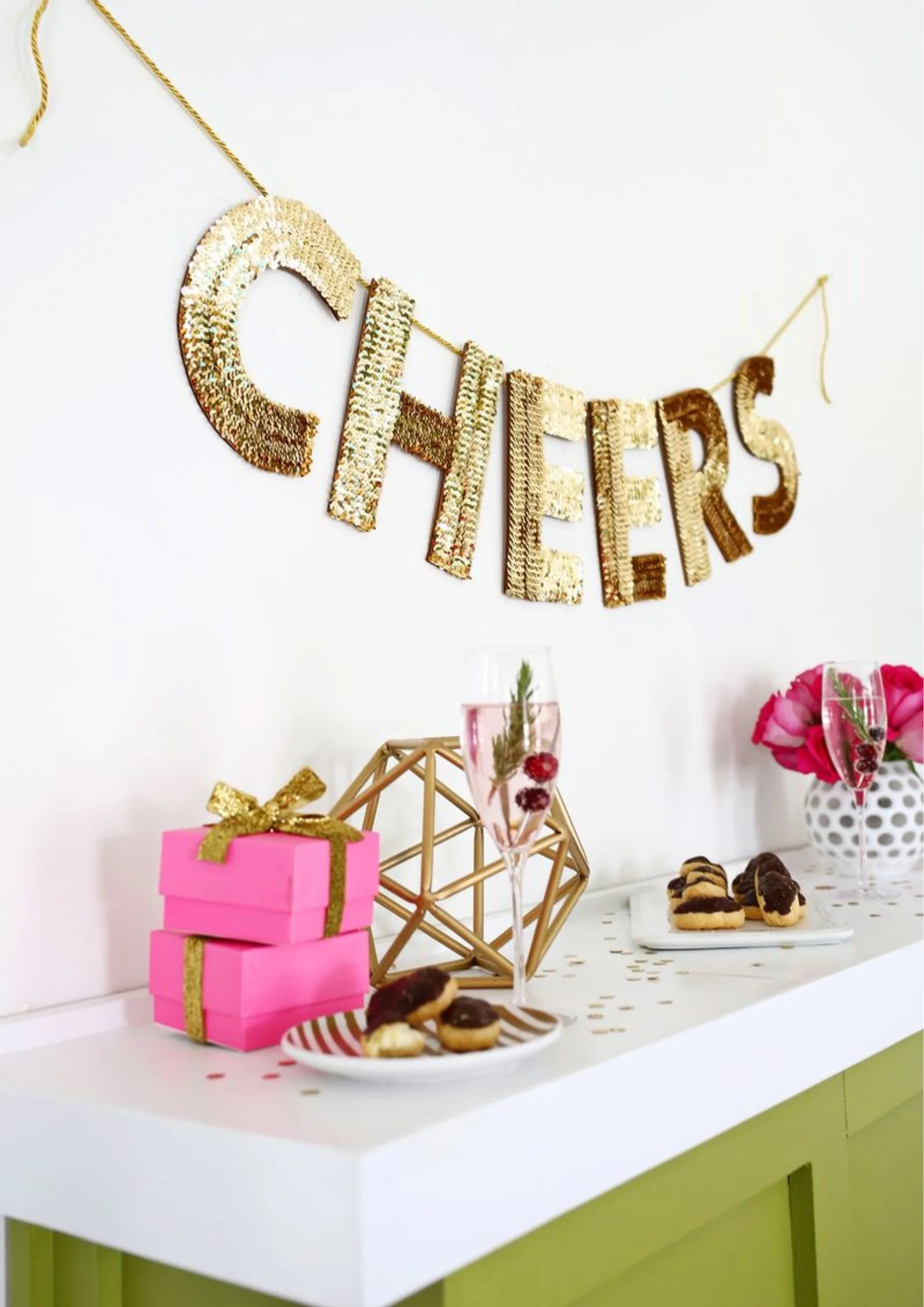 Who needs store-bought party decorations when you can make your own? You can make a sparkly sequin banner that says "Cheers". String the letters together with ribbon or twine, and hang it above your party table for a dazzling photo backdrop.