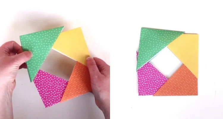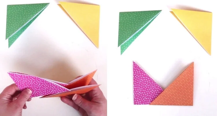 You want each piece to have one closed side (the folded side) and two open sides. The longest open side should have two pockets inside for you to slide the next piece into.