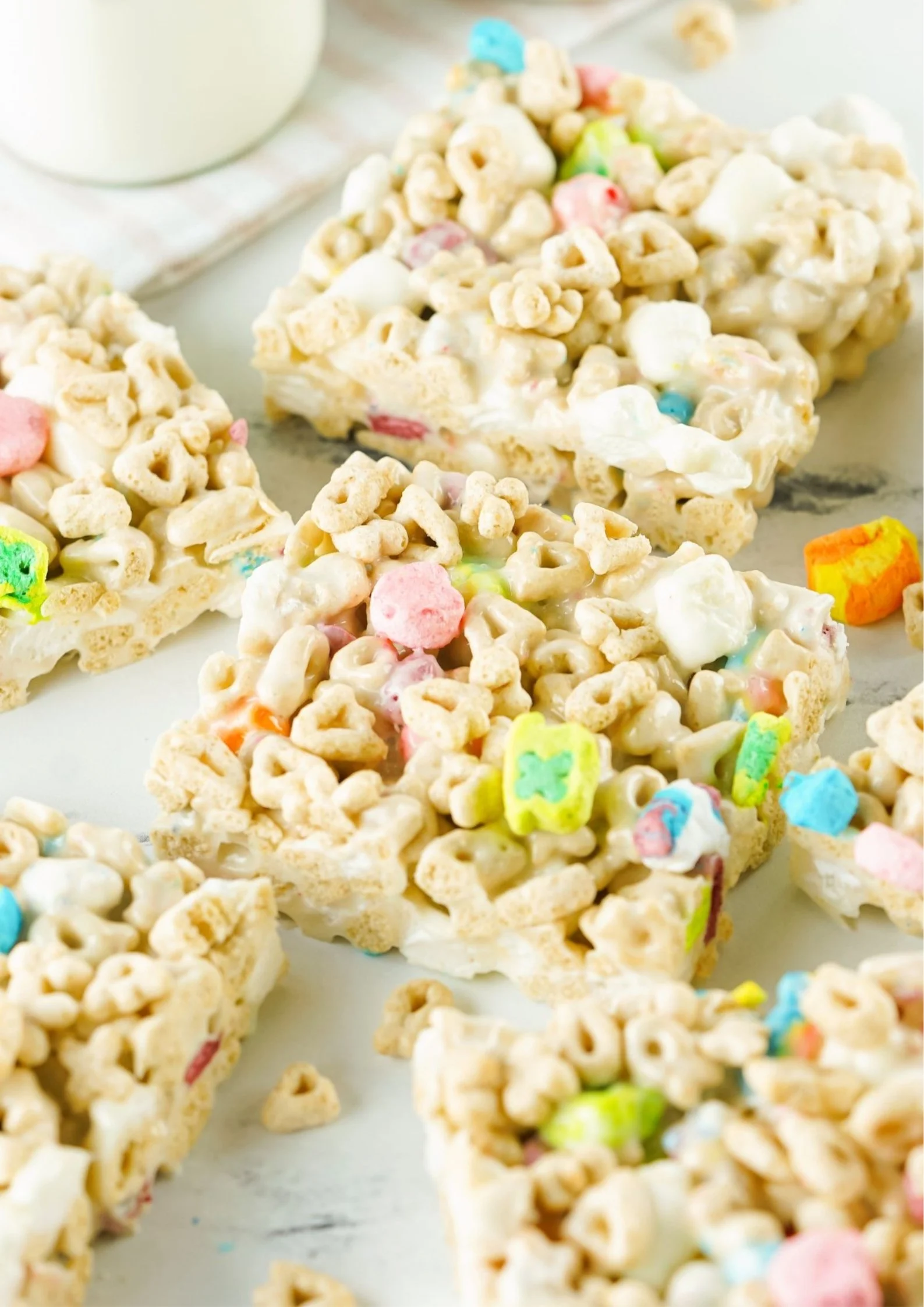 These Lucky Charms Marshmallow Treats are a colourful twist on the classic Rice Krispie cereal bar. A fun no-bake dessert that can be made with only 3 ingredients.