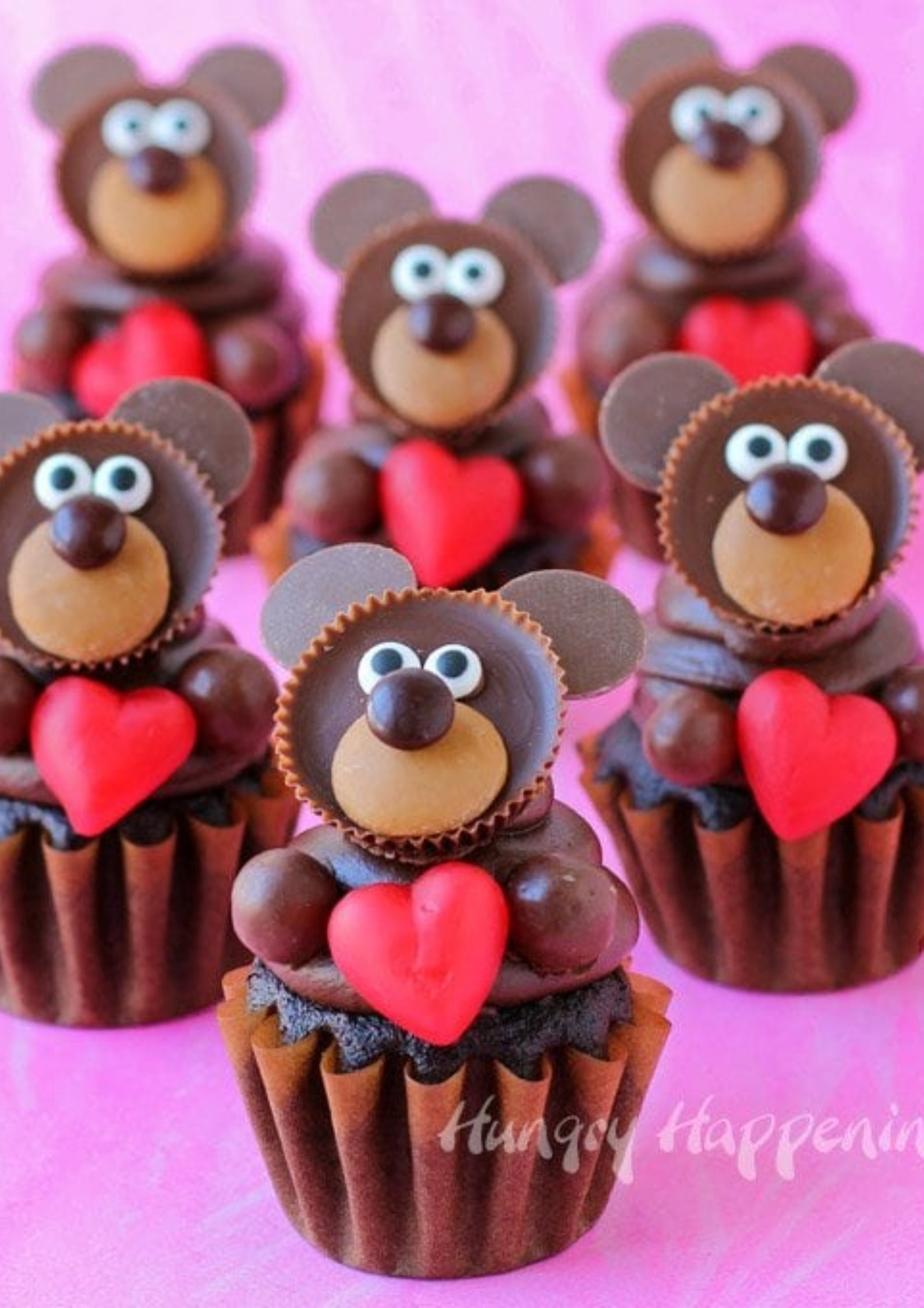 These Chocolate Teddy Bear Cupcakes could not be any cuter. Each one is topped with a peanut butter cup bear and is holding a bright red candy heart.