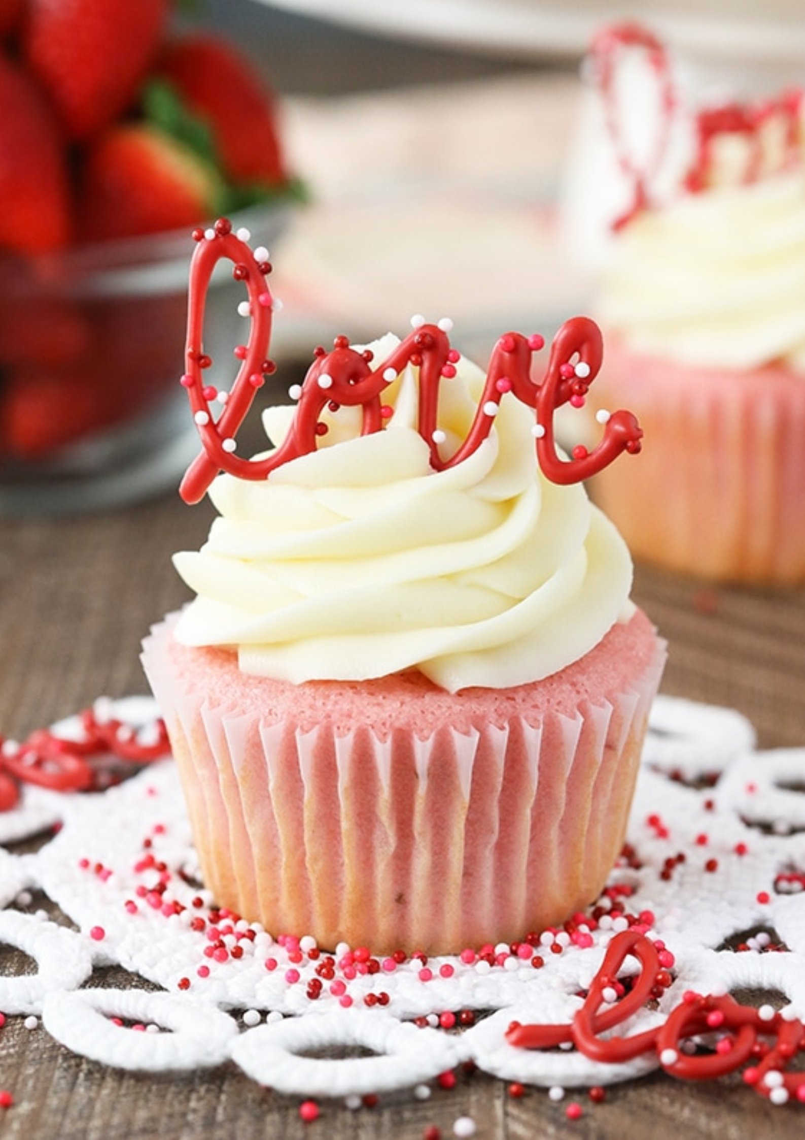 You can keep them sweet and simple with a chocolate-dipped strawberry on top or decorate everyday vanilla cupcakes with cream cheese frosting and fun Valentine sprinkles.