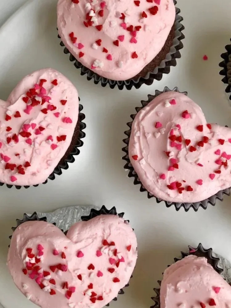 Pick from dark chocolate cupcakes, red velvet cupcakes, heart cupcakes covered in red sprinkles, or homemade cupcakes topped with strawberry frosting.