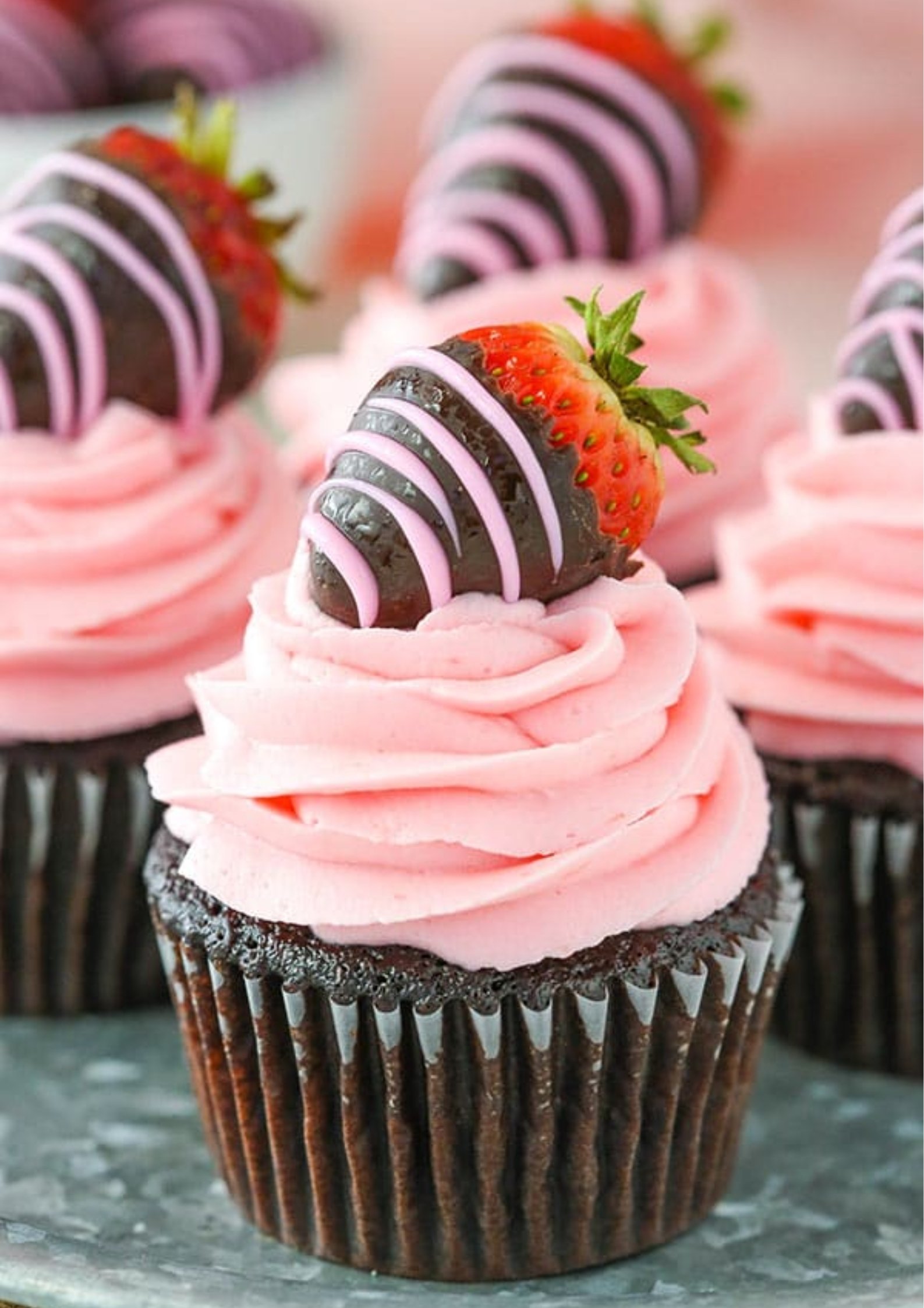These Chocolate Covered Strawberry Cupcakes are made with a moist chocolate cupcake recipe, fresh strawberry frosting and delicious chocolate covered strawberries.