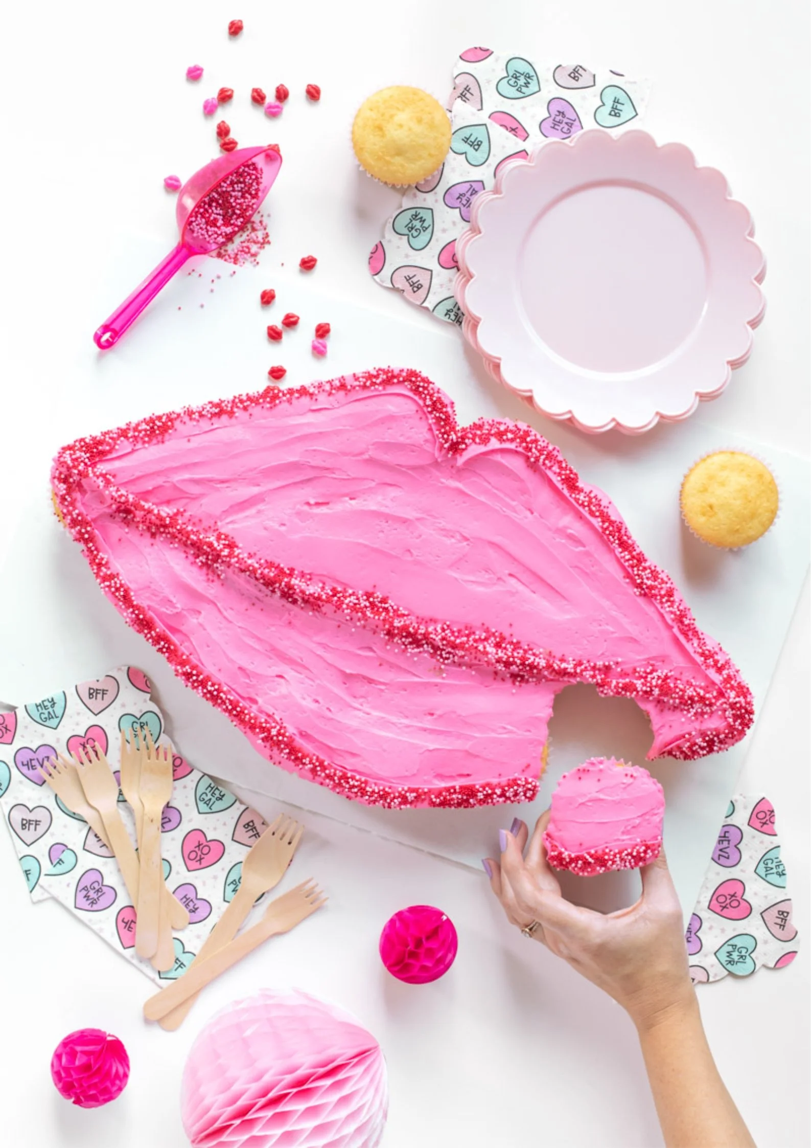 Check out this easy cake decorating hack for using cupcakes to create this lips cupcake cake – AKA it looks like one large cake but it’s actually cupcakes!