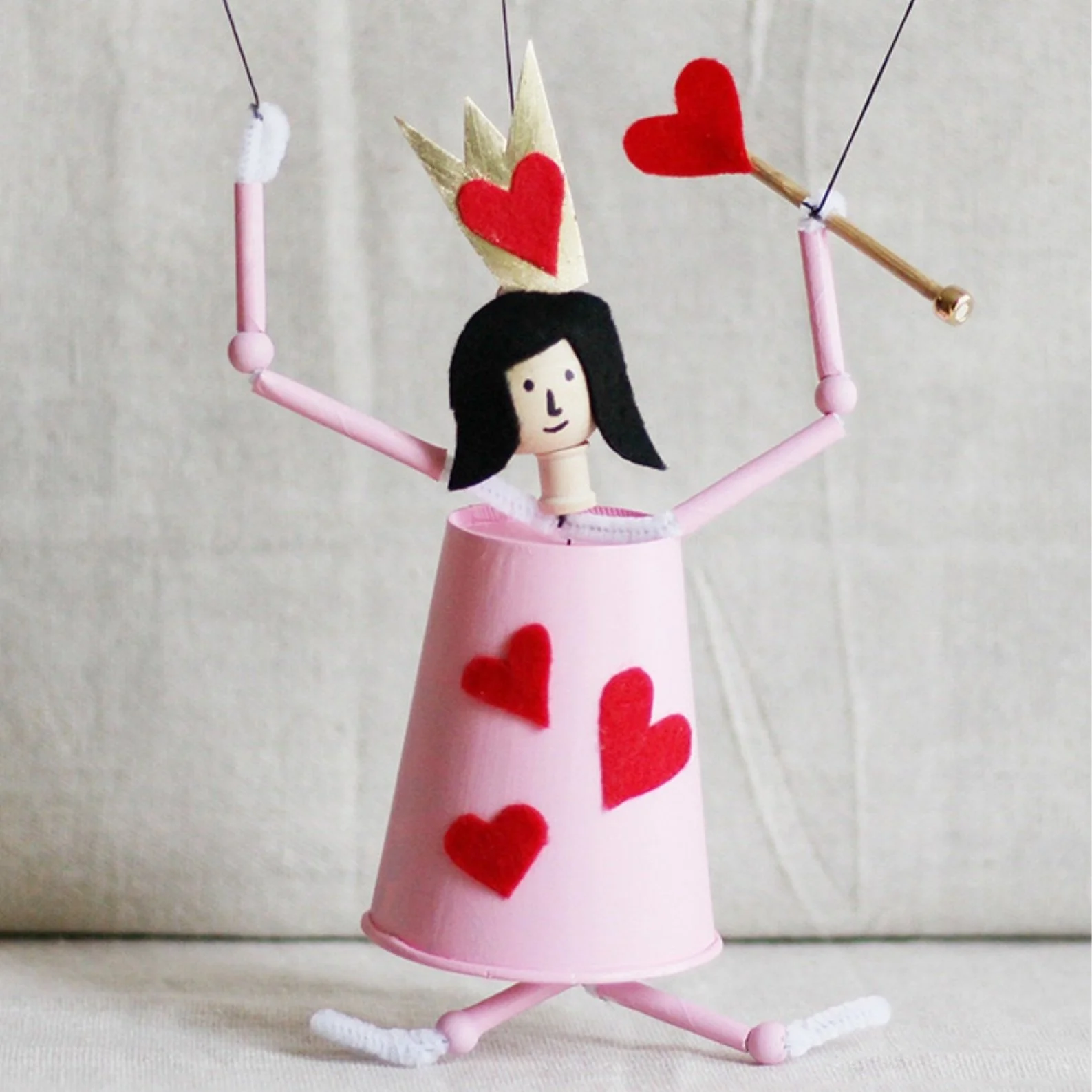 Make this royally cute Queen of Hearts puppet! It uses painted straws, pipe cleaners, and wooden beads as the main structure and a paper cup as the Queen’s robe.